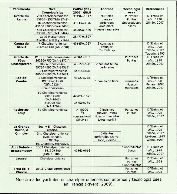 | Yacimientos chatelperronienses con adornos y tecnología ósea en Francia. |