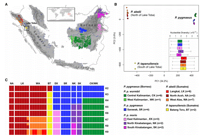 | Distribución, diversidad genómica y estrucutra poblacional de Pongo. El contorno, indica la extensión de Sunda durante el Último Glacial Máximo. Nater et al (2017). |