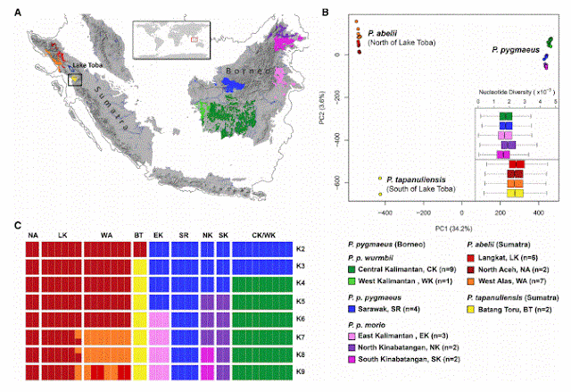 - Según Nater et al (2017), la separación entre los orangutanes de Borneo y Sumatra se produjo hace ca 674 ka.
